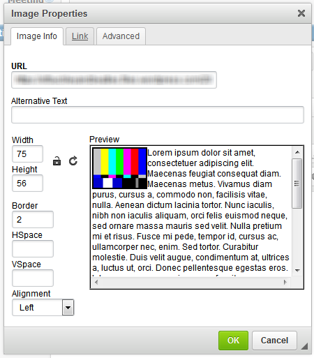 To make the image a link, use the Link tab in the image dialog box and enter the URL that the image is to direct users to when clicked. Once you have completed setting up your image, click ok. The image will be inserted into your layout.