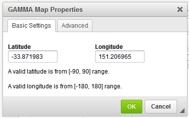 Enter in the latitude and longitude of the address you wish to display on the map (For instructions on how to obtain this information from Google Maps, please click here). To resize the map, click on the advanced tab. Once you have entered the required information, click ok to insert the map into your layout. The map will be displayed as a pin in the builder. |