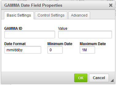 GAMMA ID is the name of the field. Value is the pre-selected (default) date to be presented to the user (leave blank if none) Date Format allows you to determine the format to display the date. Minimum Date and Maximum Date allow you to define limits to the date that can be selected. Eg: -1M in Minimum and 1M in Maximum will restrict selection to one month on either side of today's date. Use D, M or Y for the appropriate unit of measurement. |