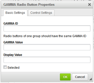 GAMMA ID is the ID given to the group of radio buttons to link them together as the options for one piece of information. GAMMA Value is the value returned in the response to you if the radio button is selected when the form is submitted. Display Value is the radio button label which will be displayed to the user. Selected indicates the radio button will be pre-selected when presented to the user in the form.