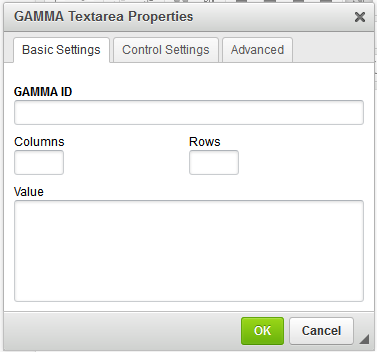 GAMMA ID is the name of the field. Columns is the number of characters wide the textarea should appear by default Rows is the number of lines long the textarea should appear as default Value is the pre-filled (default) value presented to the user (leave blank for none)