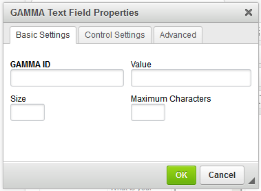 GAMMA ID is the name of the field. Value is the pre-filled (default) value presented to the user (if required, leave blank for none) Size is the number of characters long for the text field to appear. Maximum Characters is the limit on how many characters the user can enter into the field.