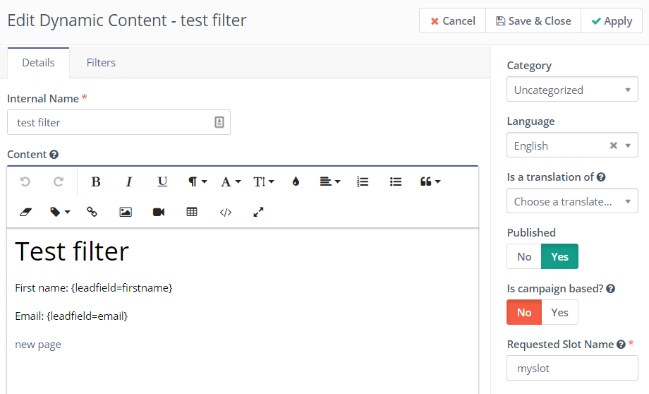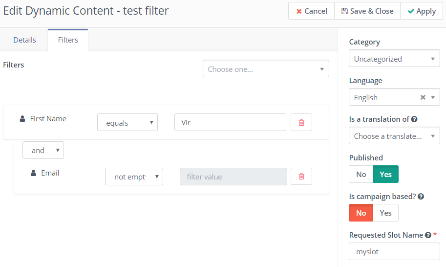 This feature allows Users to configure filters (like in segments) so a Landing Page with a DWC (Dynamic Web Content) token or slot can display content based on specific conditions.