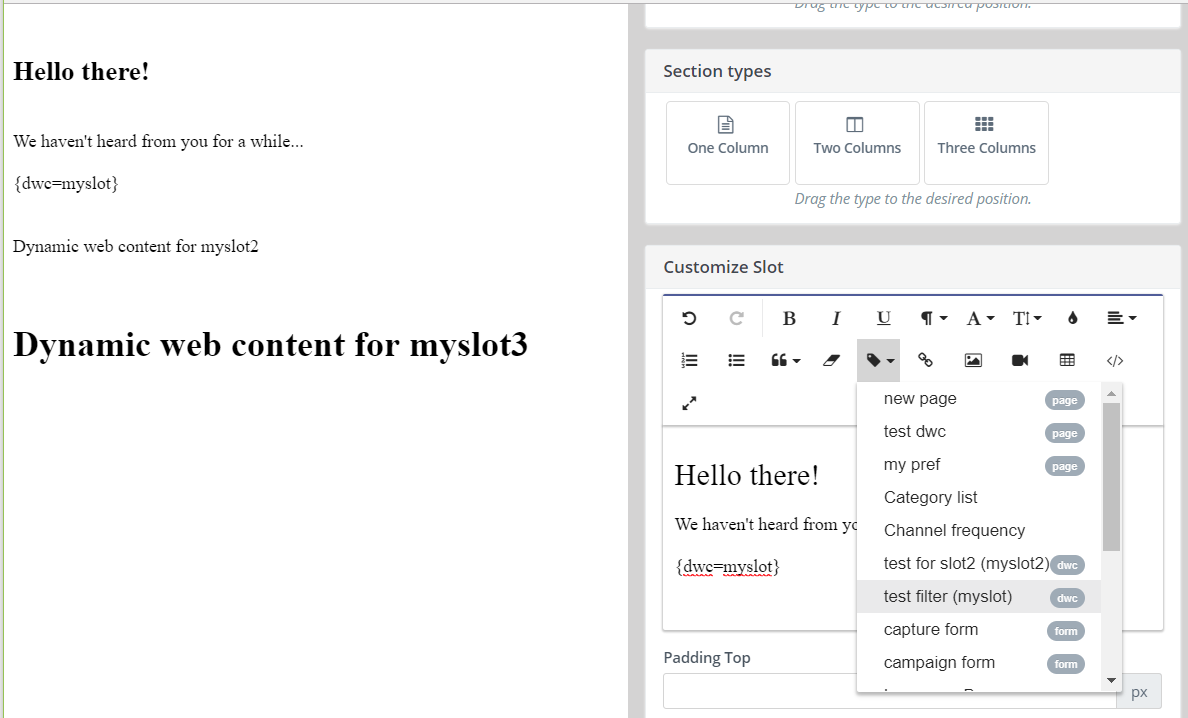 Step 3 : On a landing page, add a token or a slot for the new dynamic web content you just created.