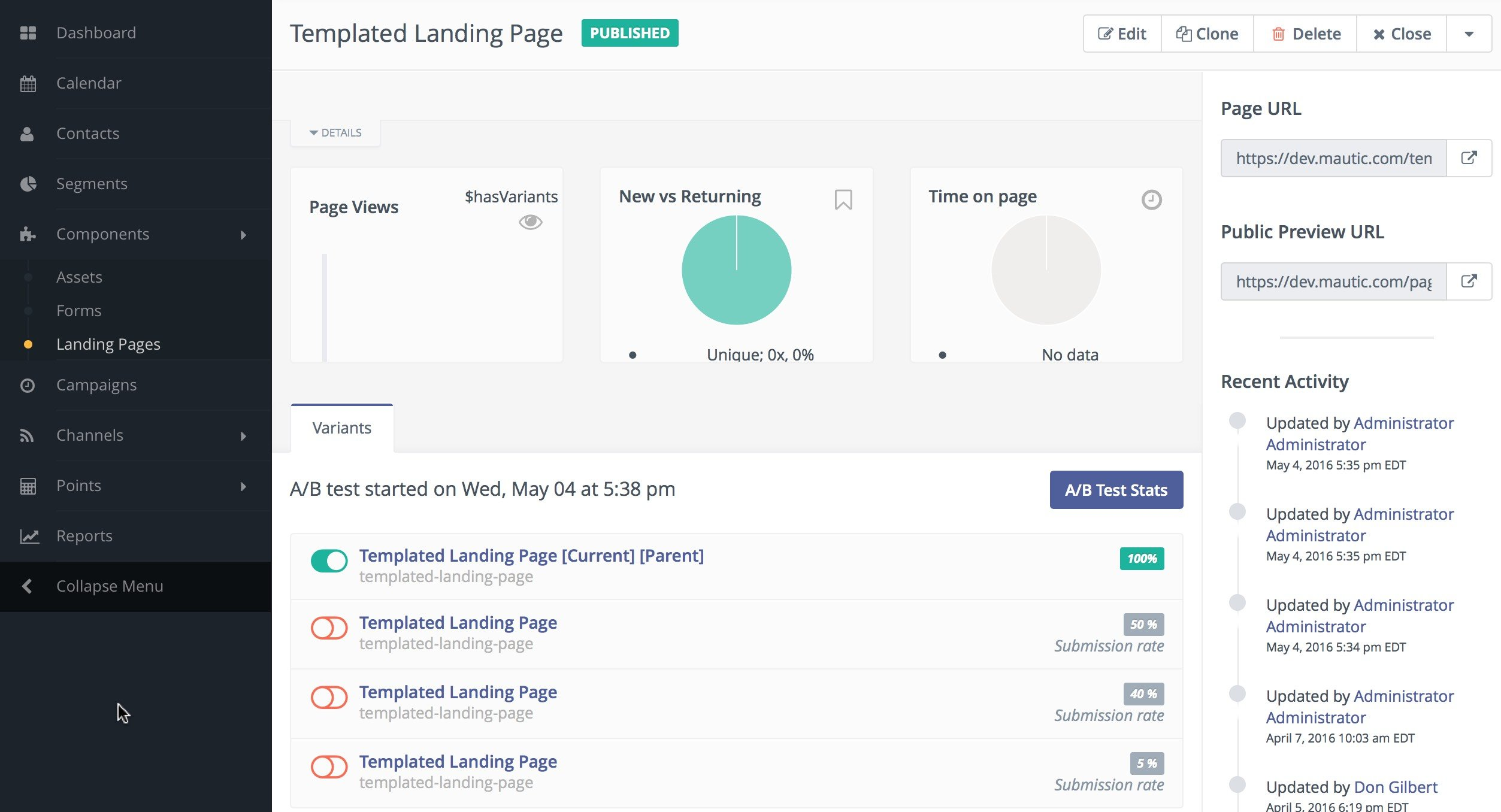 The pages can be unpublished and published again with a click of a button or by setting publish/unpublish date in the page configuration. Un-publishing a page means that contacts will see the 404 message (page not found) instead of the page itself.