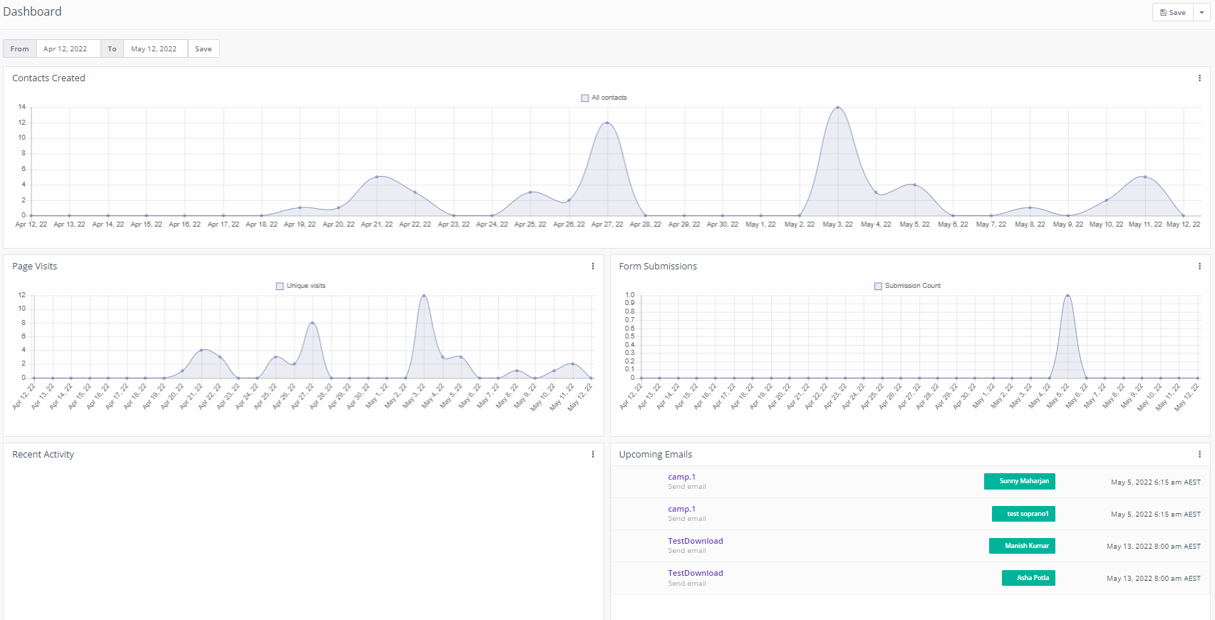 The only widget exceptions which display the same information irrespective of the date range are Upcoming emails and Recent activity.