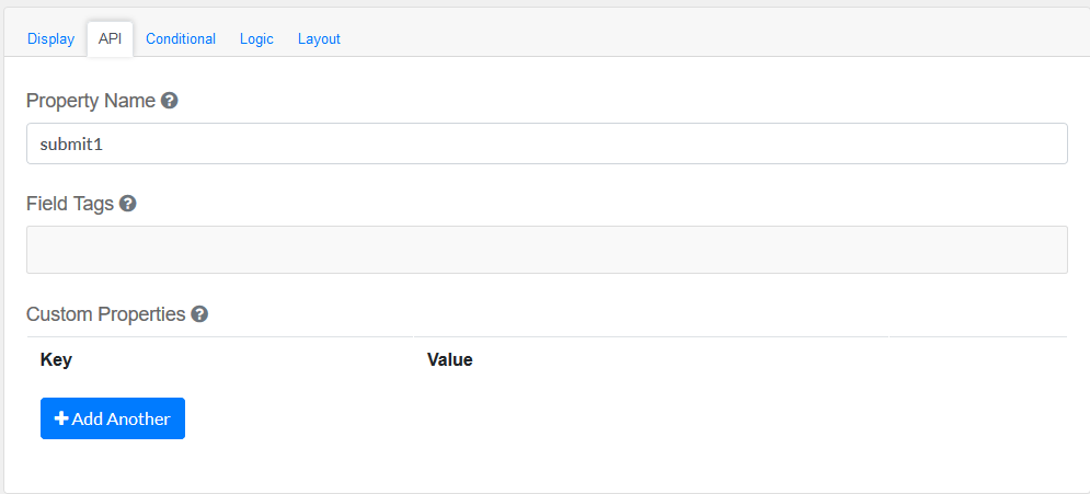 Users configure any custom properties for this component. Use Add Another button to add more than one key.