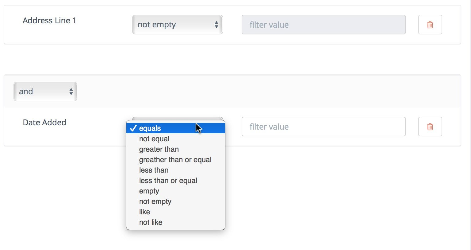 Having selected the field, Users can then choose the type of operation to perform. These vary depending on the way Contacts are to be filtered.