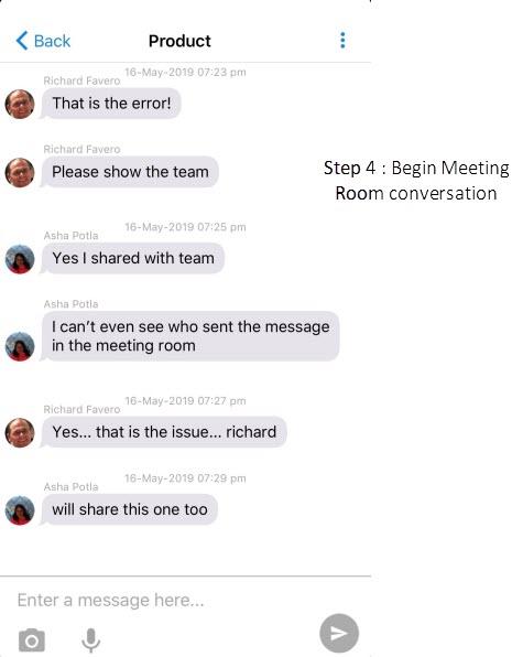 •Tap the Meeting Name to change the subject of the conversation. Enter in your message content and press Send. This will create the Meeting Room and send the first message, notifying the other contacts about the new conversation. |