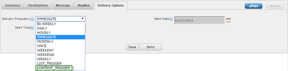 The delivery options tab allows you to select the timing of the delivery of any messages on this order. To link this order to your RSS Feed, select the CONTENT_TRIGGER option from the Delivery Frequency dropdown field. You can then set a start date and time for messages to be sent as a result of RSS content being received.