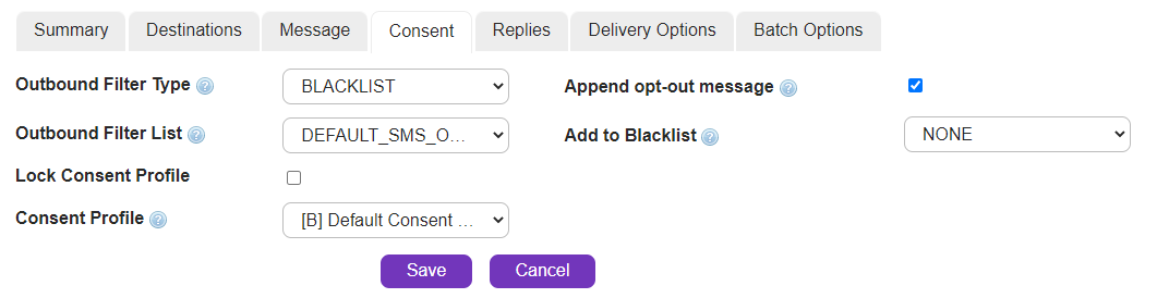 This field is not active if the 'Append Opt-Out Message' check box is ticked in the 'Consent' tab. This prevents any conflict if an alpha-tag is selected as the source address, since replies can not be sent to an alpha-tag source.