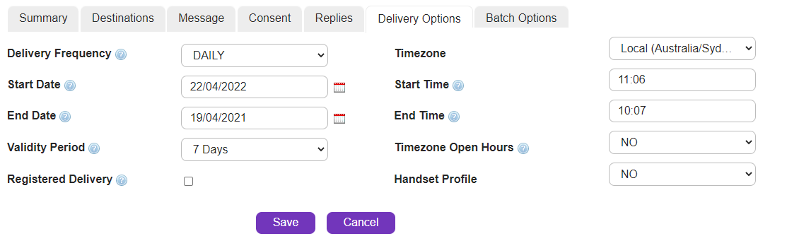 e.g. if 'Delivery Frequency' is 'MONTHLY' and 'Start Date' is '01/09/2012', the message will be delivered on the first day of each subsequent month (01/10/2012, 01/11/2012, 01/12/2012 etc).
