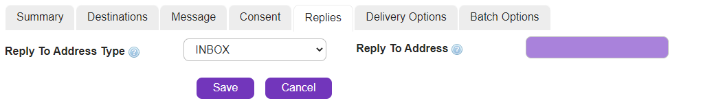 Type/paste the reply email address, phone number, or URL for each message type. If 'INBOX' is your Reply to Address Type, this field is not required (replies will go straight into the messages inbox within SOPRANO MEMS.
