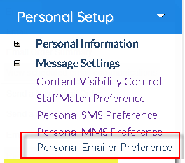 Click the 'Personal Emailer Preference' link in Email tab drop-down menu (also accessible via 'Setup' menu on left-hand side).