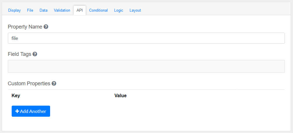 Users configure any custom properties for this component. Use Add Another button to add more than one key.