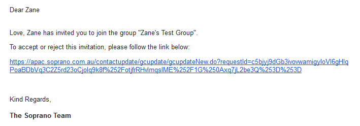 The following is an example message received by a contact who has been sent a group invitation email: