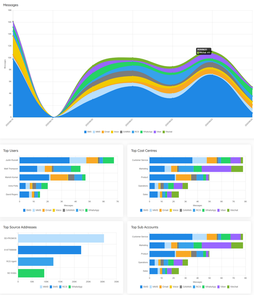 This section provides several sets of 'at-a-glance' reporting statistics relating to message traffic, as detailed below. Simple SMS messages can be also be sent from the 'Dashboards' screen.