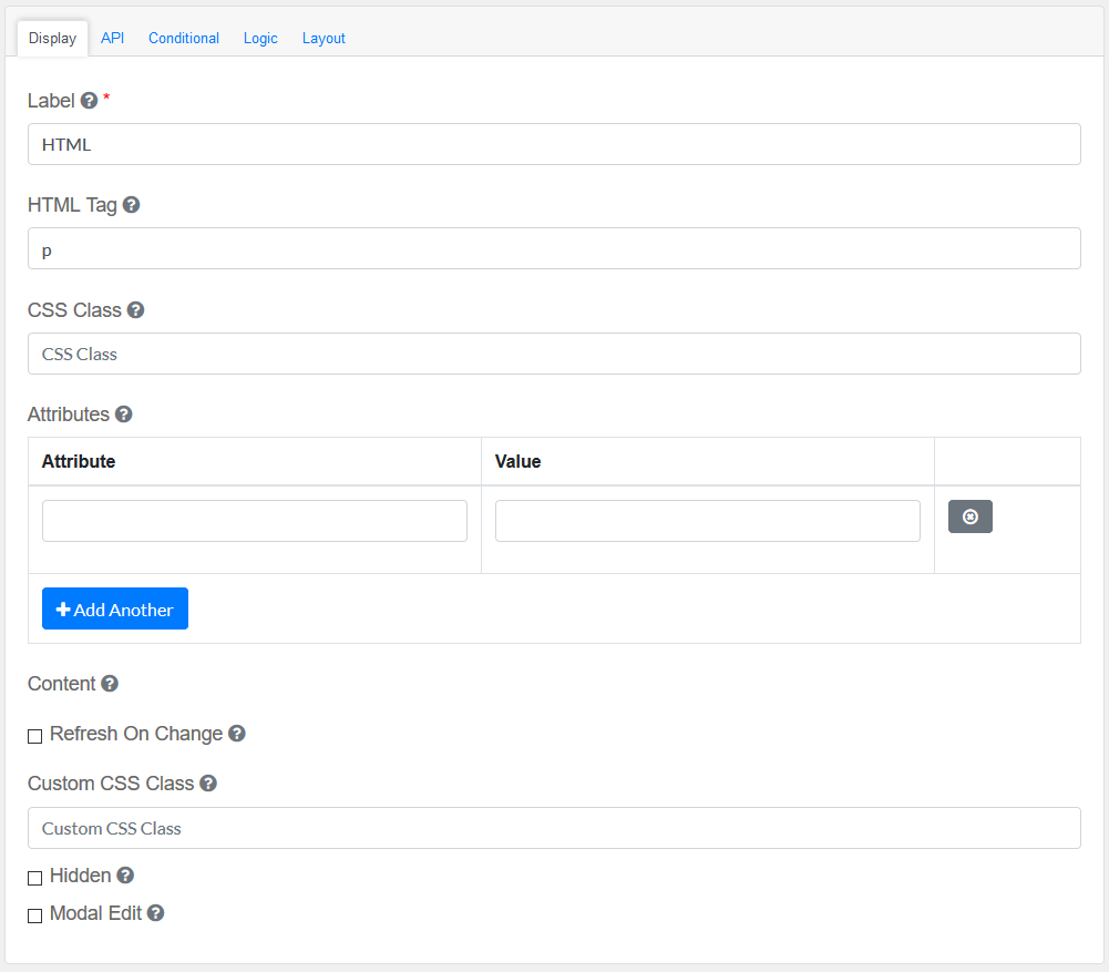 This section provides a map of HTML attributes for a component's input element. Note: Attributes provided by other component settings or other attributes generated by form.io take precedence over attributes in this grid.
