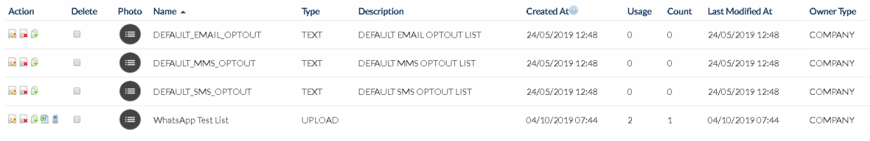 The table fields allow you to view, edit, delete, or clone list details, and send quick SMS messages (note: actions may be restricted to 'View Only' depending on the list type and owner).