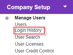 Click the 'Login History' link in 'Company Setup > Manage Users' to open the 'Login History Summary' screen.
