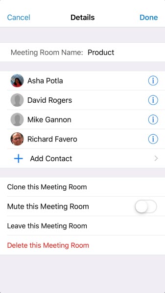 From the Meeting Room screen, tap the Details option in the top right hand corner of the screen (Android: tap