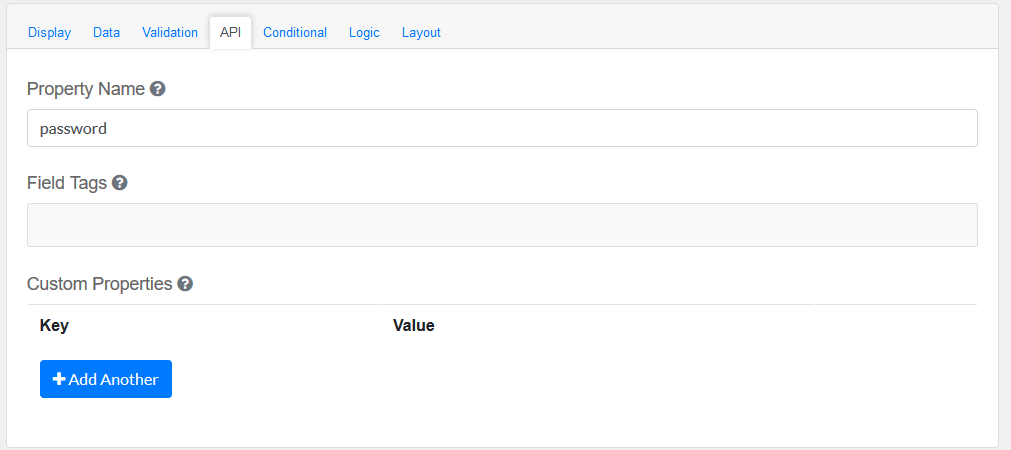 Users configure any custom properties for this component. Use Add Another button to add more than one key.