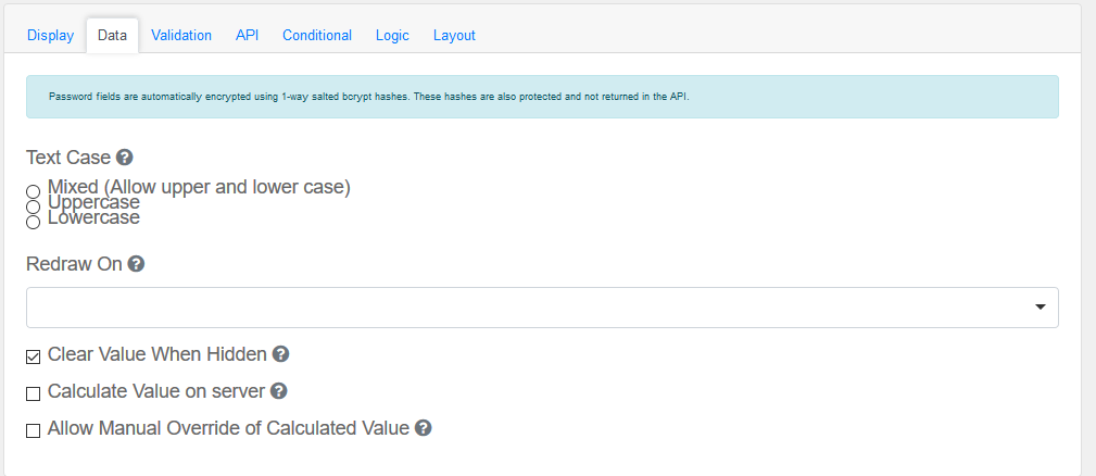Hide Input : Hide the input in the browser. This does not encrypt on the server. Do not use for passwords.