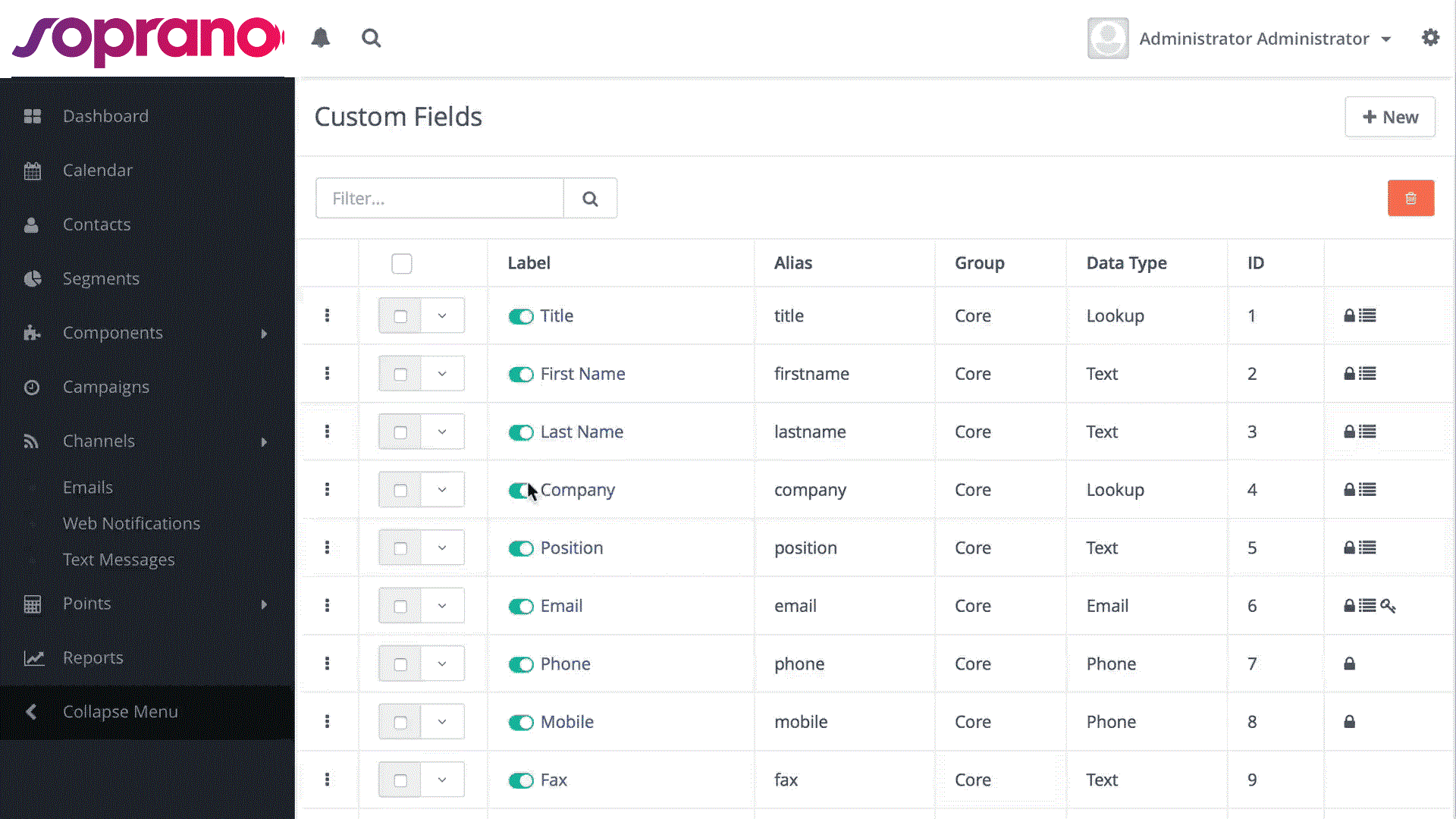The Custom Fields page will let Users view all existing Contact fields as well as any custom contact fields that have been created.