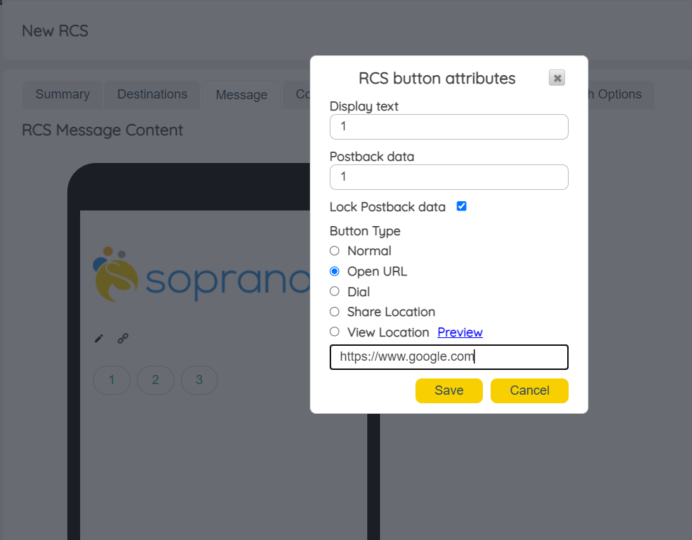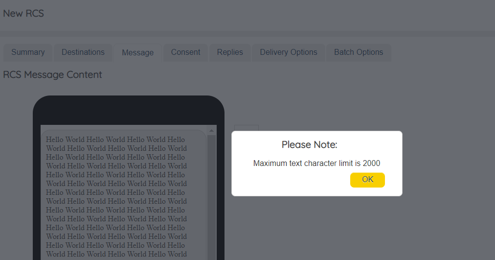 RCS Call To Action - Max Character Limit Pop-up
