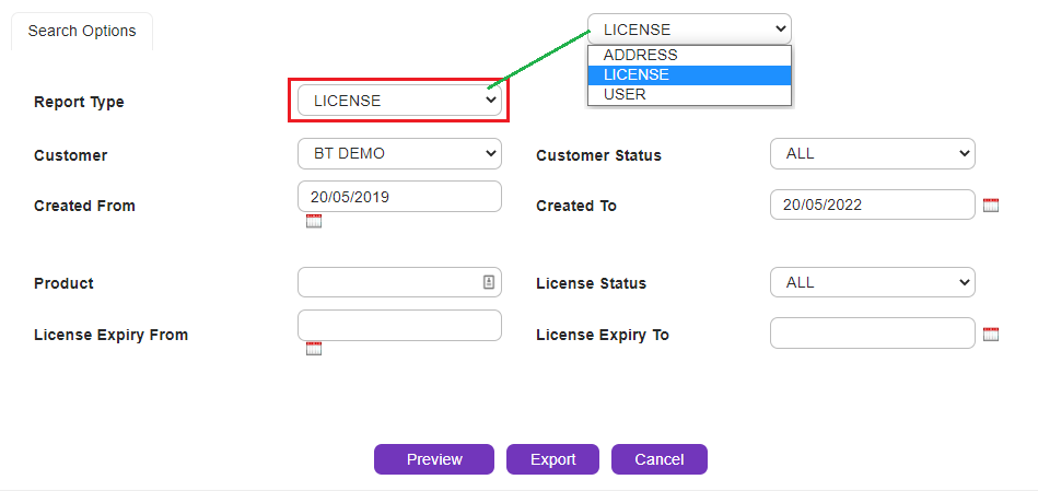 Choose Address, License or User.
