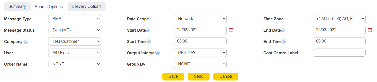 Note: SOPRANO MEMS uses the scheduled start date/time +1 day/month to calculate data range, and delivers report each day until the specified end date. Overrides any dates specified in 'Search Options'.