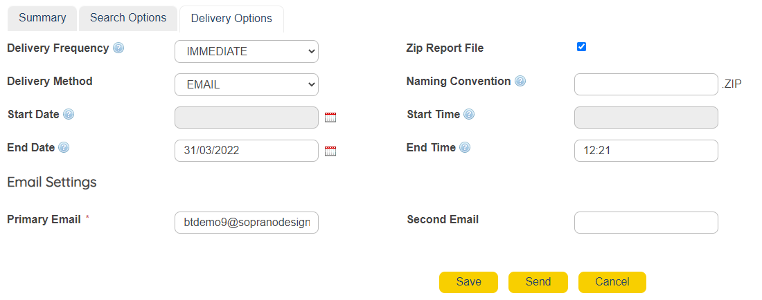 •Primary Email - Valid email address where report should be emailed (Default: current user's username) •Second Email - If delivery fails to primary email, delivery will be attempted to this address