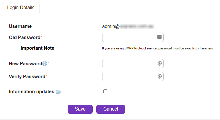 •Maximum length: 16 characters (for SMPP API users, password must be 8 characters)