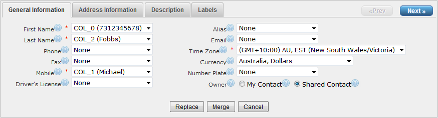 Map the data in your file into the actual fields. Any of the fields from 'New Contact' can be used as columns in your file.