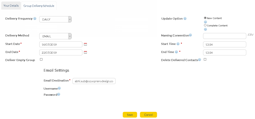 Note: This section will not appear if user has selected 'NONE' in the 'Delivery Frequency' drop-down menu in 'Delivery Schedule' section.