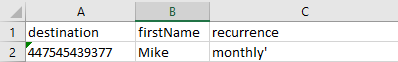 The List can also have a recurring delivery schedule mentioned within the List's Columns. When creating a list the header line can optionally contain a 'recurrence' field e.g. destination,firstname,recurrence. For list items you can optionally set the recurrence to daily, weekly, monthly or yearly (case insensitive) 447545439377,Mike,yearly.