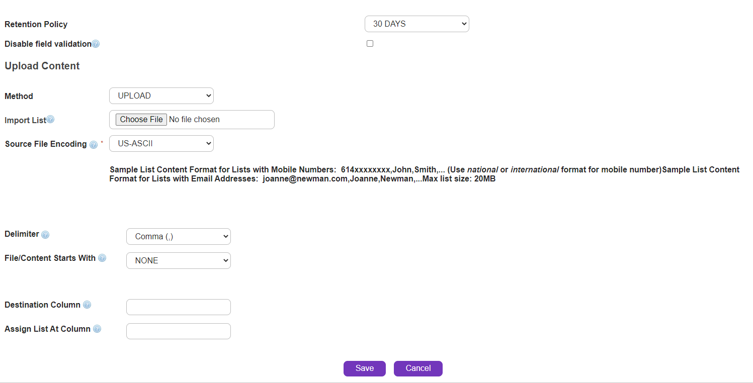 Upload list type's Retention Policy can be scheduled by users and determines how long the lists are retained within the system. The available choices are 'NONE', 'DELETE AFTER USAGE', '7 DAYS', '14 DAYS', '30 DAYS' or '90 DAYS'. The default Retention Policy value is '30 Days'. Users can modify the retention policy per List, as per their specific needs.