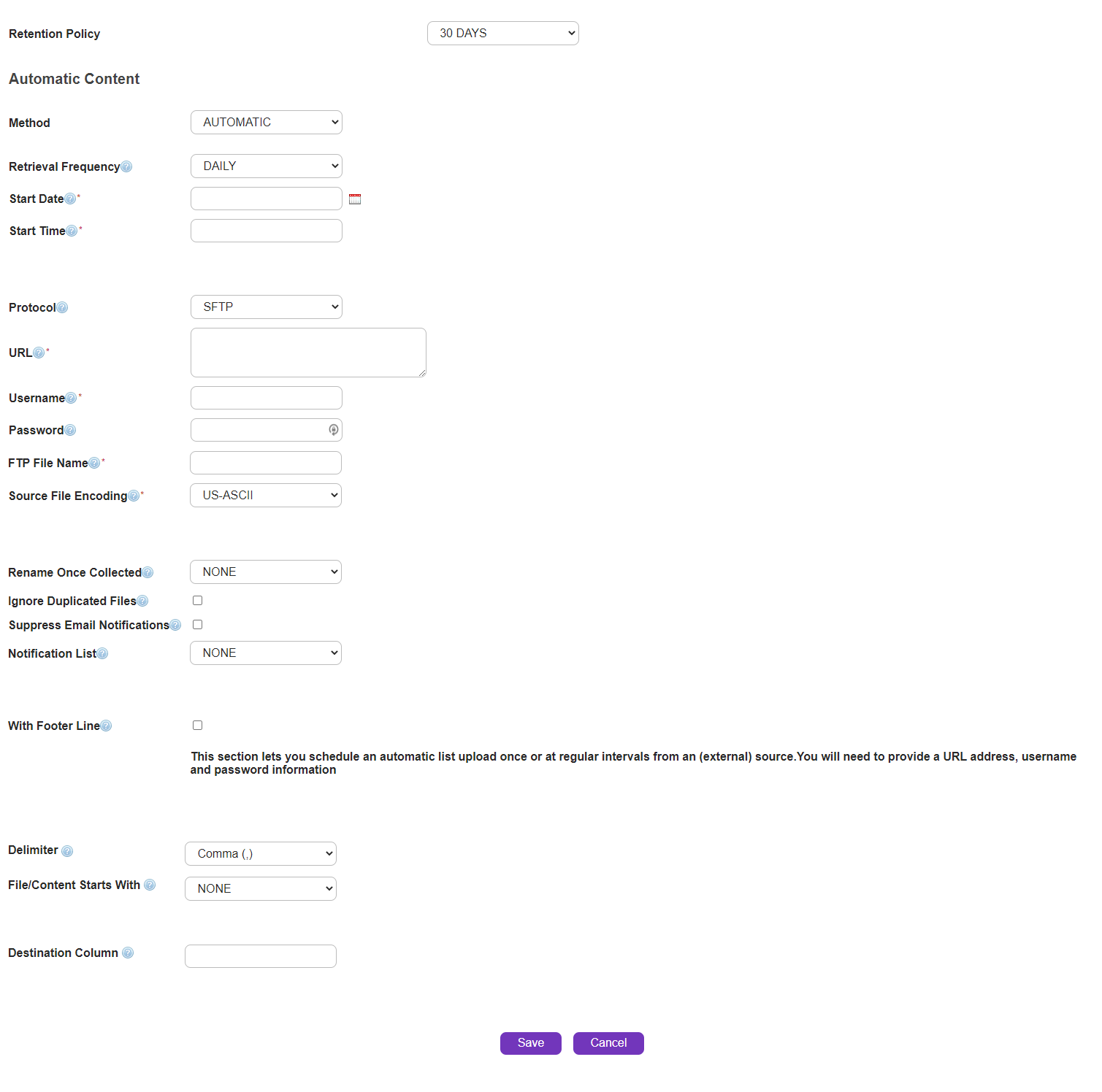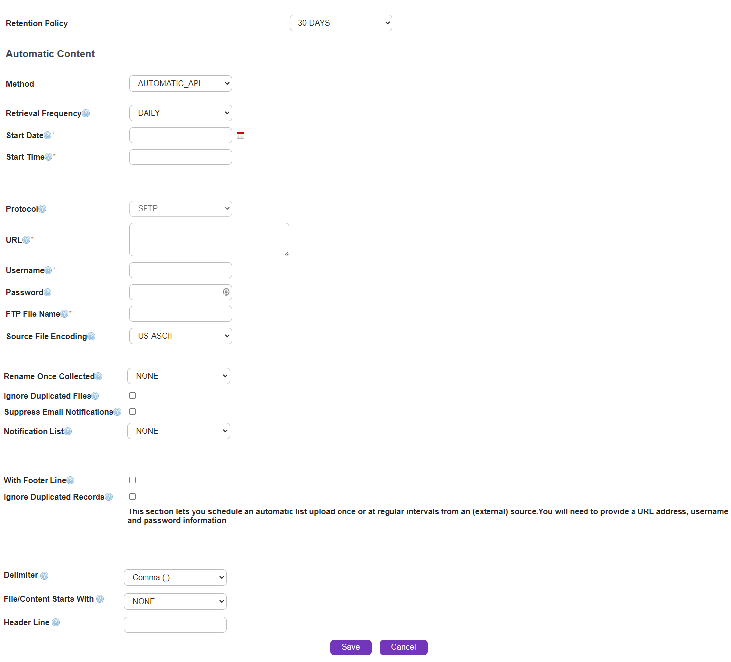 Data can be scheduled to be automatically uploaded from an external FTP site (automatic lists). These uploads can be scheduled to occur at specific times or on a recurring basis.