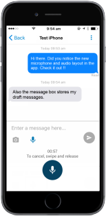 Users have the option to cancel the message by swiping and releasing the microphone icon. The instructions to record, cancel and send audio message is displayed on the microphone tray as shown in the image. The audio message will appear in the chat thread with the total clip duration displayed on the right end of the audio.