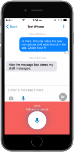 User can touch and hold the microphone icon to begin recording. The message duration will be displayed on the screen while audio is being recorded. User can release the microphone icon to send it to the recipient. The maximum duration of a recording is 1 minute.