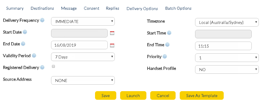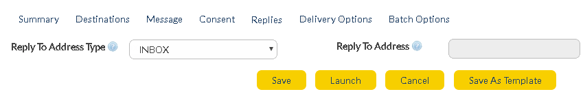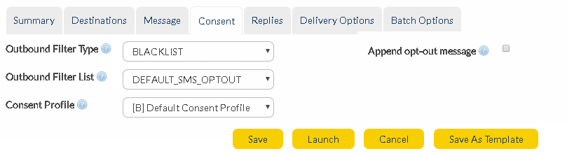 This field is not active if the 'Append Opt-Out Message' check box is ticked in the 'Consent' tab. This prevents any conflict if an alpha-tag is selected as the source address, since replies can not be sent to an alpha-tag source.