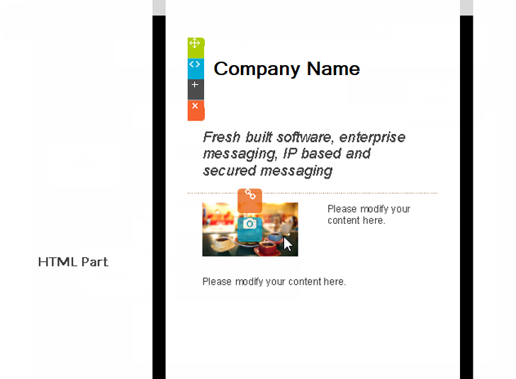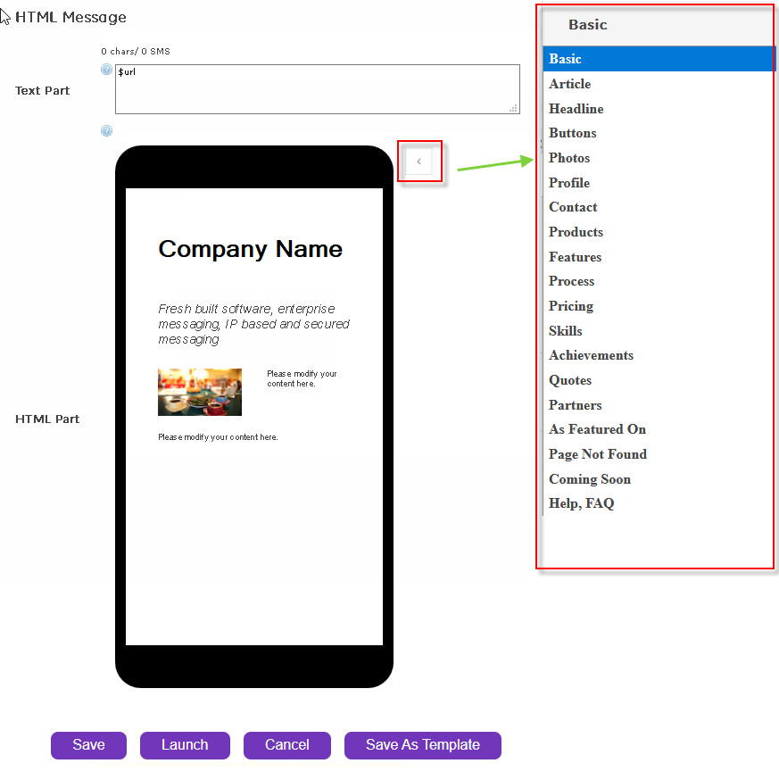 HTML allows you to create an HTML message page (by means of drag-and-drop elements) which is stored on the LDAP (Active Directory) Plug-in server and displayed in the mobile device's browser when the message recipient clicks on a link sent to their mobile device via SMS.