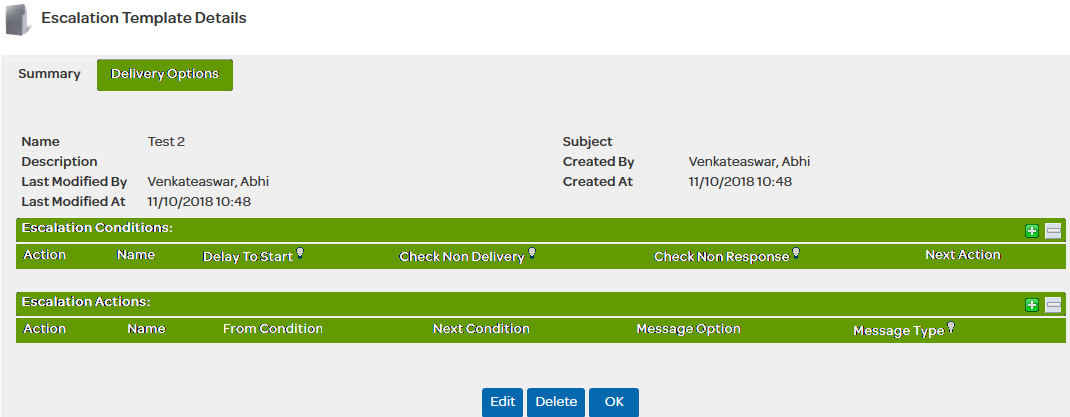 Escalation Actions can be configured by clicking on the icons in the "Actions" table.