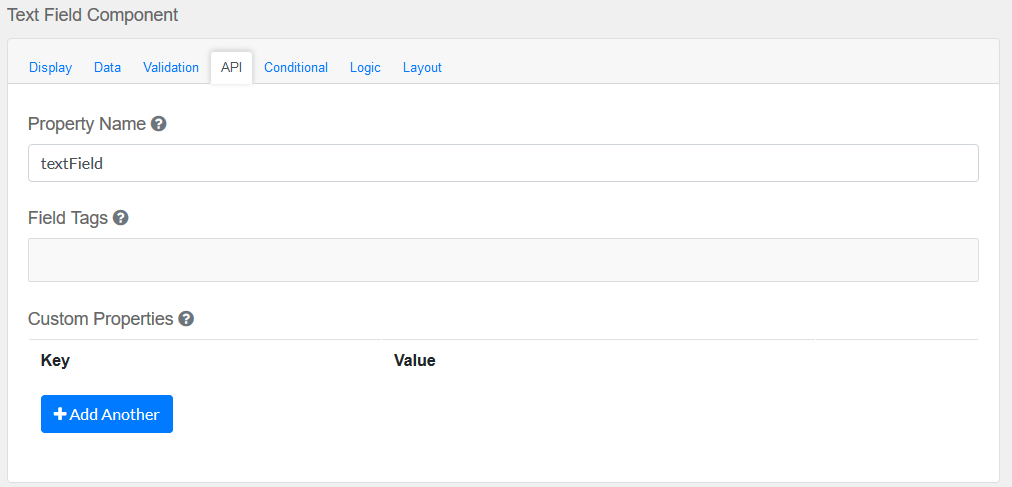 Users configure any custom properties for this component. Use Add Another button to add more than one key.