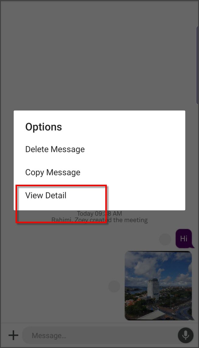 Tapping on the status indicator pie brings up a pop-up with the meeting room participant's avatar indicating if the message has been "Sending or Sent", "Delivered" or "Read". |