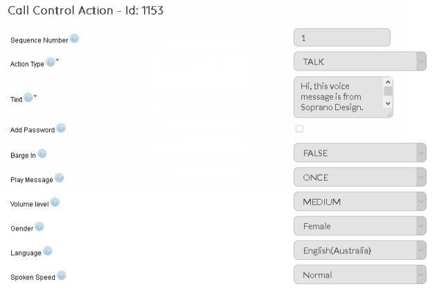 b) Add one Call Control Actions - Talk. Select Talk and enter the text for voice message - " Thank you for your time. We will reach out to you after 24 hours.". Below is how the Call Control Action screen would look like: