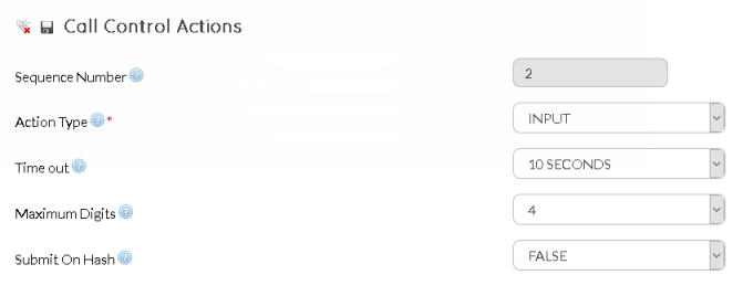 b) Add two Call Control Actions - Talk & Input, in the same order. Select Talk and enter the text that needs to be converted to speech. We will enter - " Please enter your 4 digit PIN followed by hash sign". Select Input as the last Call Control Action to provide key press input option to Simon. Below is how the Call Control Action screen would look like: