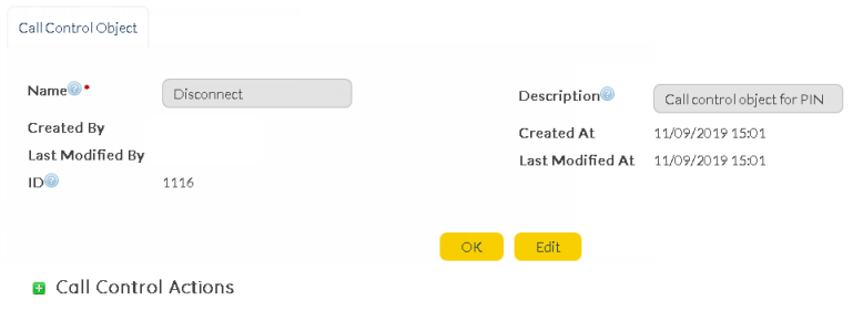 a) Let's create the third Call Control Object "Disconnect". This call control object is created with the purpose of a sending a voice message to Simon before disconnecting the call. Note that this flow has not been presented in the IVR Call Flow example and may be considered as additional user-experience step.