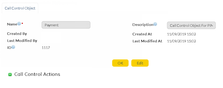 a) Let's create the second Call Control Object 'Payment'. This call control object is created with the purpose of sending voice message with payment options for Simon.
