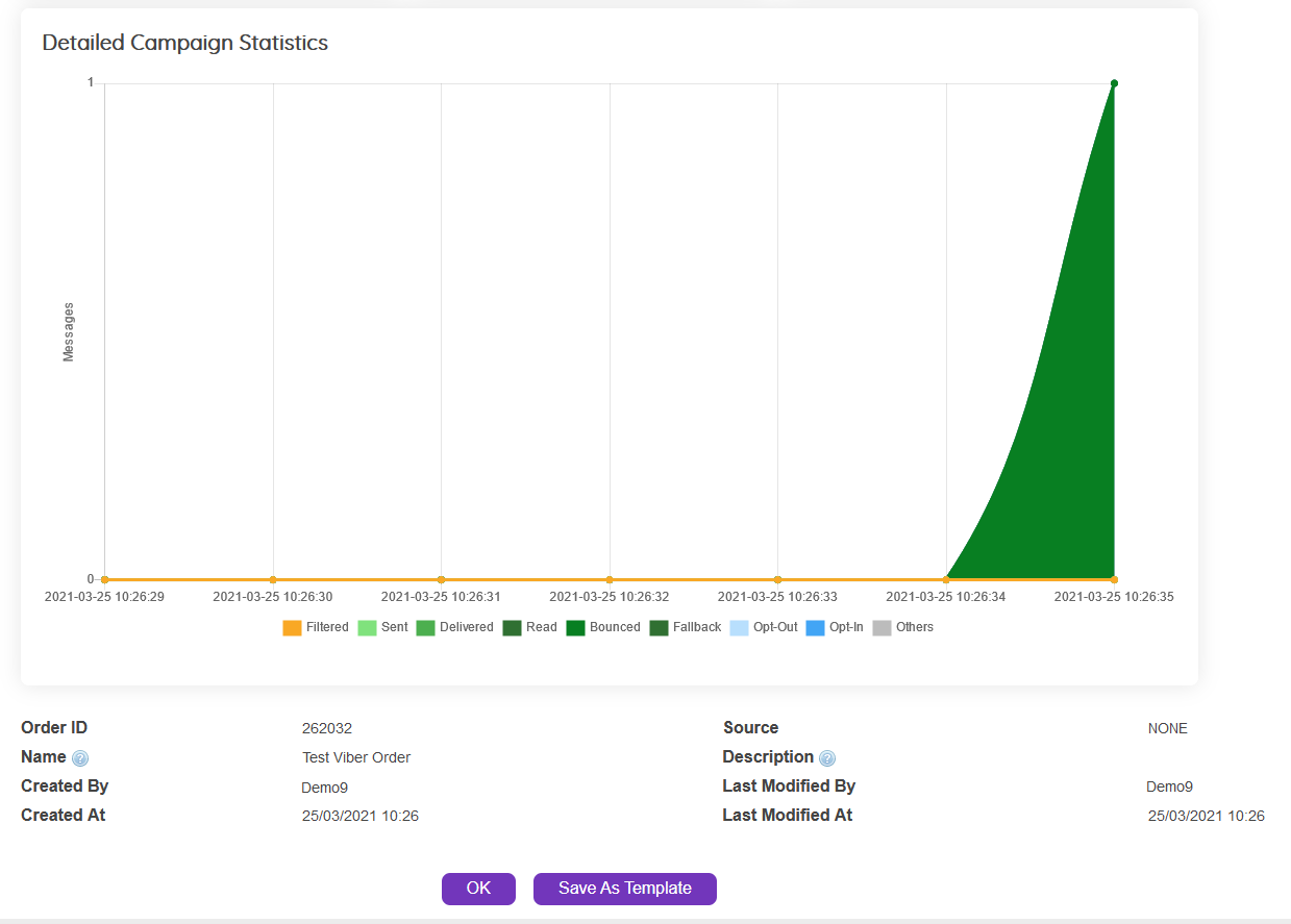 After the Order is launched, the page displays the status of the message along with other critical details.